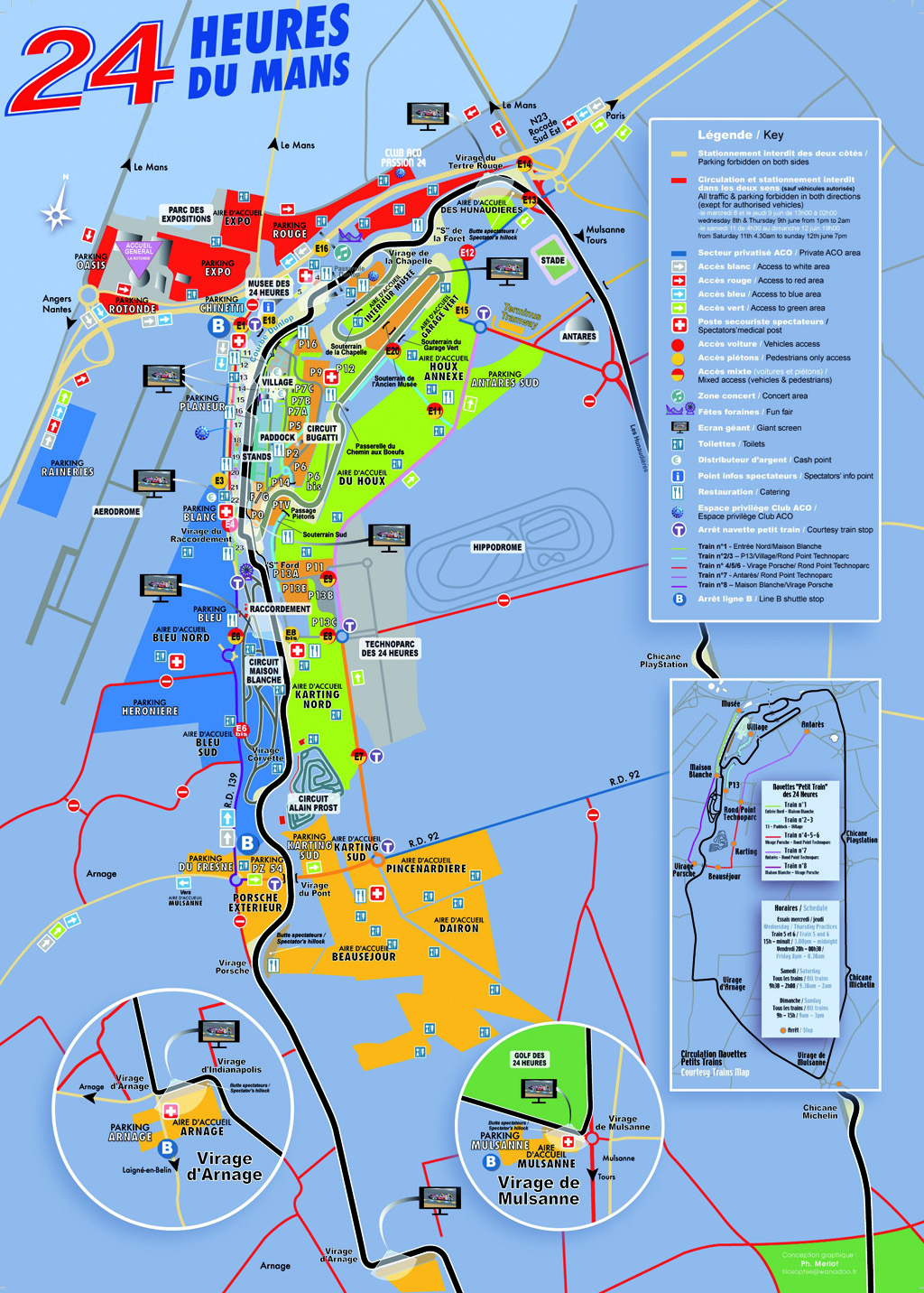 – ZONE JAUNE : située au Sud du circuit, ainsi qu’à Mulsanne et Arnage, des navettes gratuites sont mises en place pour vous faciliter le trajet jusqu’aux tribunes, Village et animations.