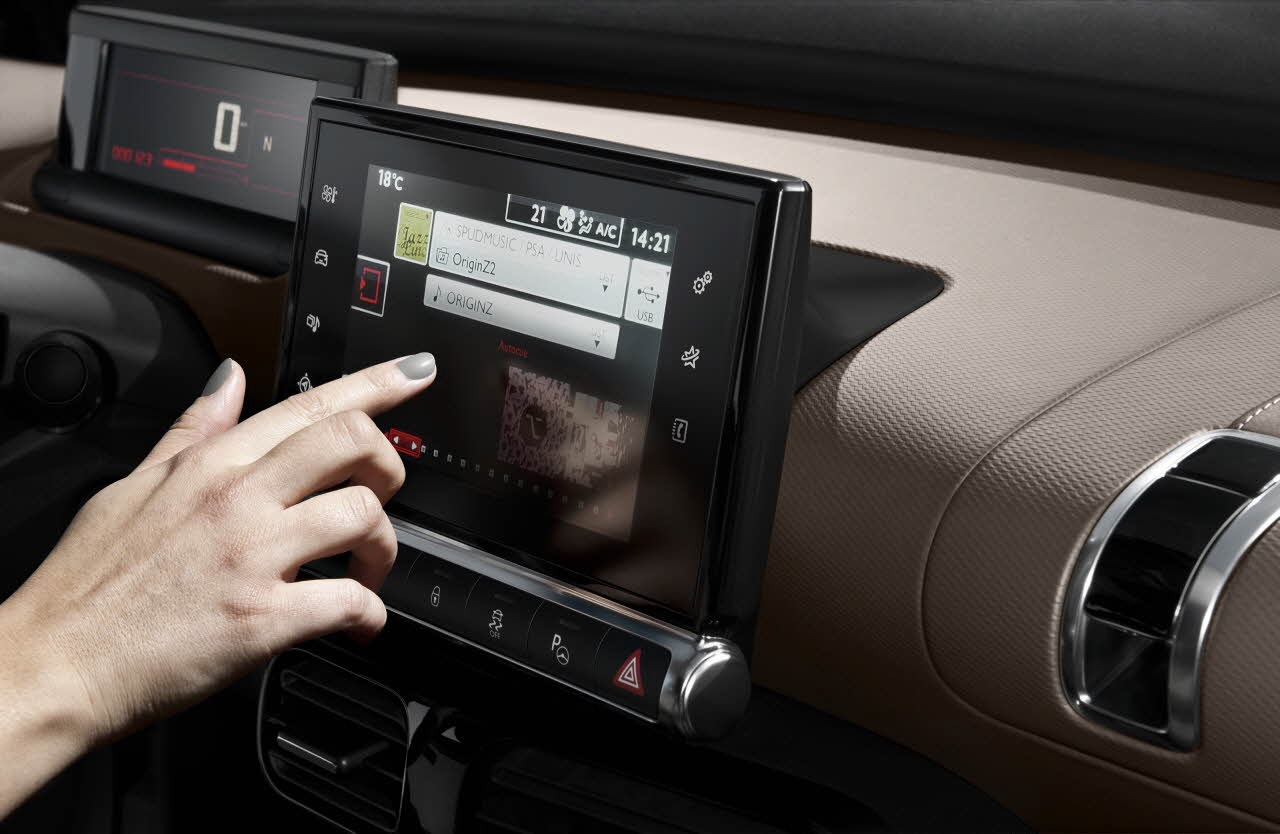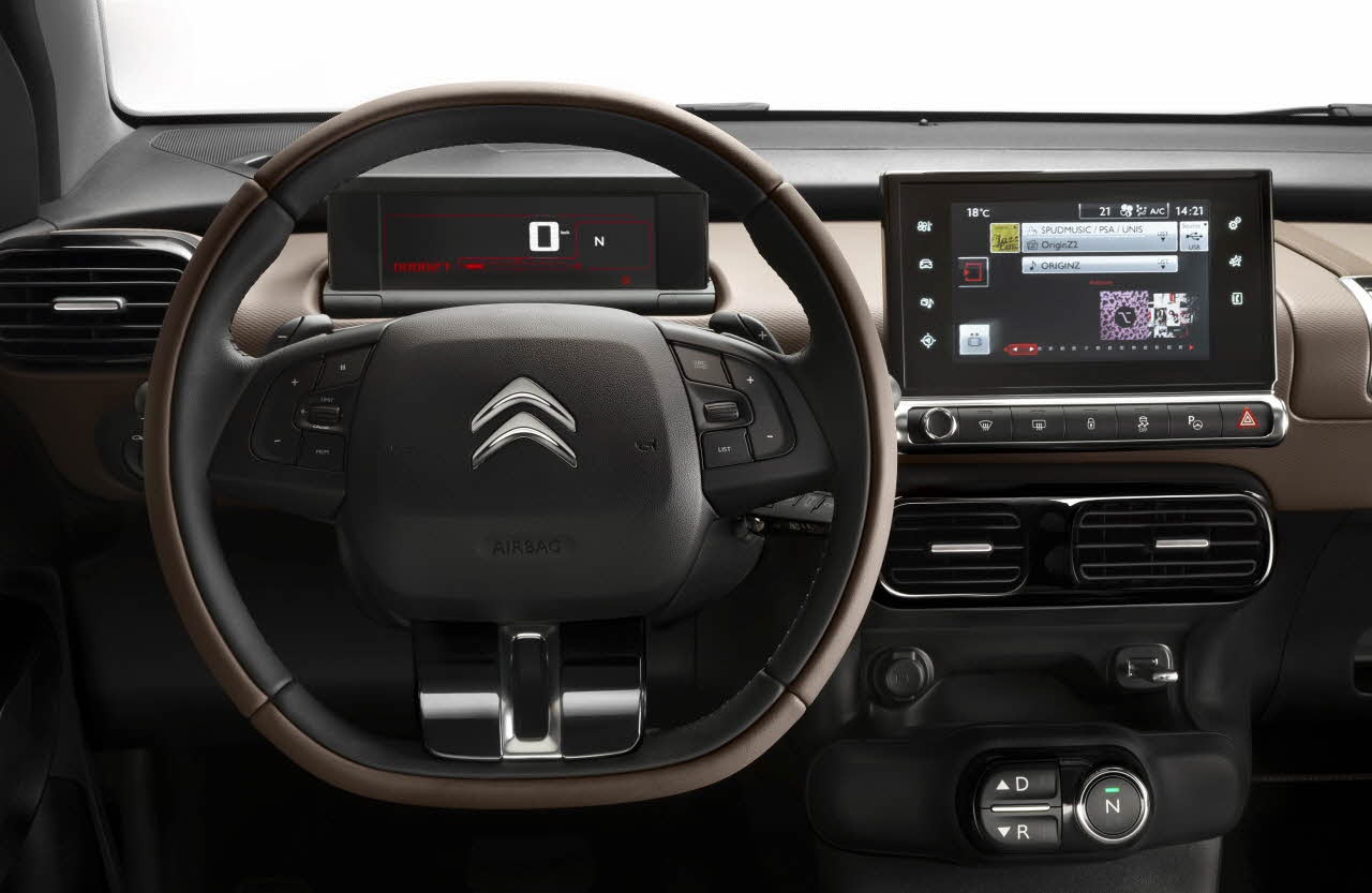 Là aussi Citroën, avouons-le à faire du bon travail. C’est tout simplement très « joli ». Rien que sur la planche de bord, on retrouvera tout de suite un travail minutieux et soigné. Elle est fine, et assez basse pour offrir un maximum de visibilité sans pour autant nuire à la position de conduite. La console centrale a été remplacée par un écran tactile unique. Et tout ou presque est digital. Côté fonctionnalité, elle a ce qu’il faut. Multimédia, GPS, Clim, et même la boîte robotisée (optionnelle). On notera qu’à l’avant, on aura droit à une banquette intégrale (comme dans les 2 CV). À ne pas oublier le toit, transparent, qui illuminera encore plus l’intérieur de cette belle C4 Cactus.