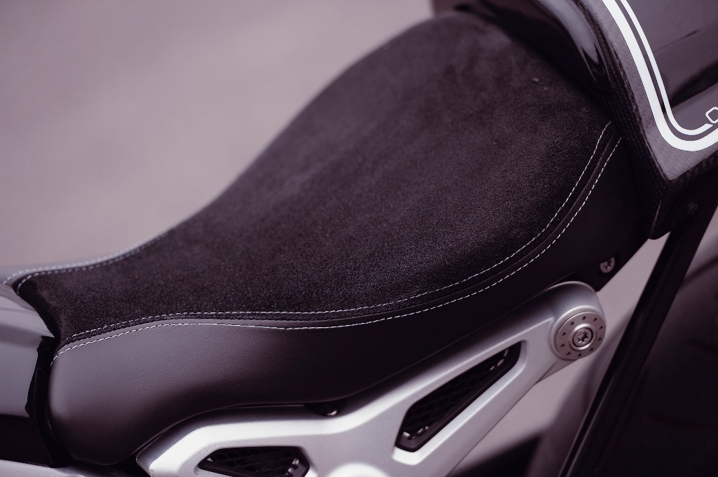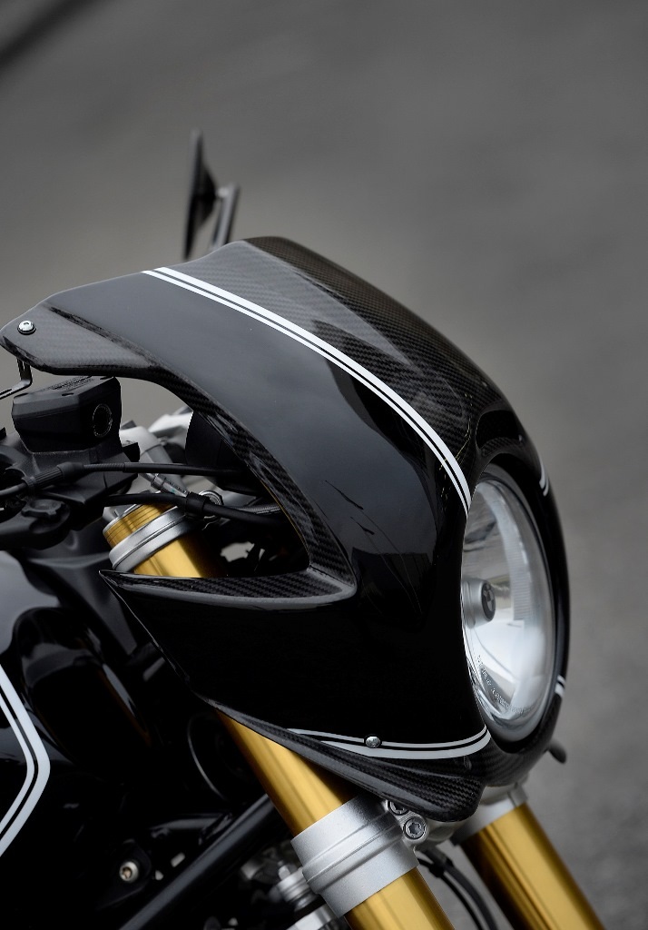 Boxer Design a mis le paquet: tête de fourche et dosseret de selle monoplace en carbone, guidon plat avec embouts taillés dans la masse, sans oublier le support de plaque spécifique, équipent cette nouvelle moto entièrement transformée. Les rétroviseurs en aluminium anodisés noir ont eux aussi été taillés dans la masse et sur l’échappement, l’on notera la bande thermique réalisée comme au bon vieux temps. Pour finir, de superbes silencieux Akra avec à double filet blanc vient parfaire l’ensemble.