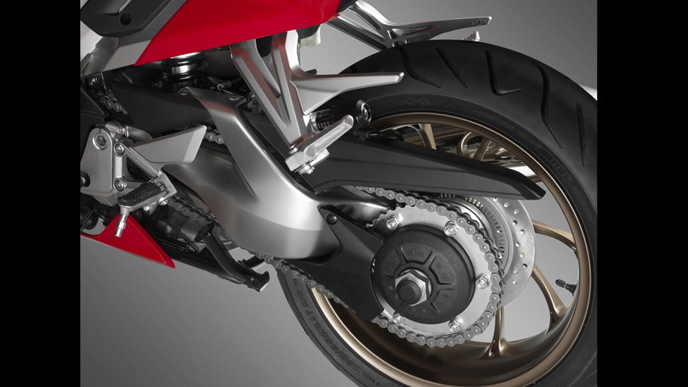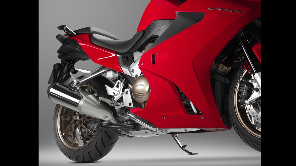 Elle est également équipée de nouvelles jantes, malheureusement cachées par l’échappement unique situé en bas à gauche, remplaçant le double échappement anciennement placé sous la selle. On remarquera aussi les étriers de freins classiques qui viennent avec le nouvel ABS à la place du freinage combiné avant et arrière. Côté motorisation, la VFR800F roulera avec un V4 de 782 cm³ à 106 chevaux. Le nouveau VTEC de l’engin s’enclenchant vers 65000 tours minute, est très discret mais laisse cependant ressortir une sonorité des plus agréables à entendre.