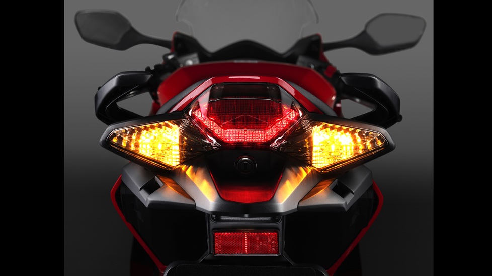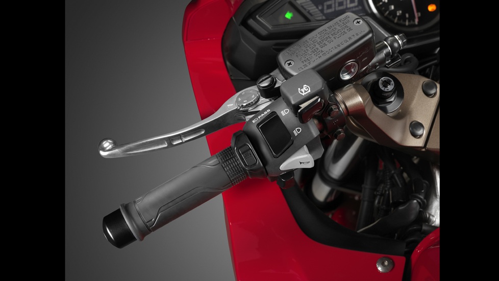 À l’avant, des changements ont également été apportés à l’optique de la moto. La forme des feux en X constituera l’une de ses particularités les plus visibles et ses nouveaux feux à LED lui confèrent une ligne aérodynamique assez prononcée. Avec un guidon plus rapproché et remonté de 13 mm, le confort du pilote sera optimisé en offrant une position de conduite plus droite. Elle se voit aussi équipée de poignées chauffantes (de série) et d’un contrôle de traction activé par les nouveaux boutons installés sur le Commodo de gauche. Le nouveau tableau de bord, assez réussi, affiche tout ce qu’il faut et combine à la fois sport et tourisme. On y retrouvera donc le compte-tours, les jauges, la consommation, la température, l’heure, mais aussi une nouveauté : un indicateur de rapport engagé…