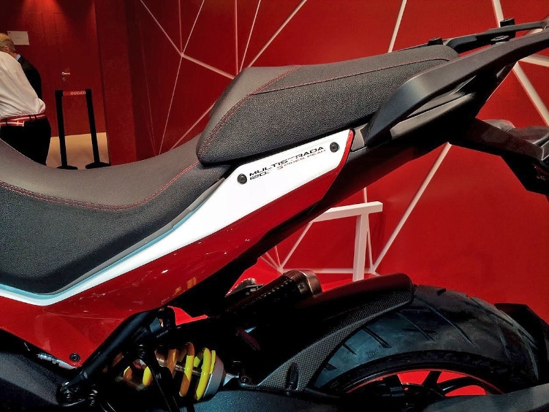 Du gris, il y en avait aussi du côté de Ducati, l’un des rares stands où j’ai aperçu des hôtesses : les perles italiennes nous jouent franchement la carte de la séduction, le stand était « lumineux, aérien, rouge aussi ». Dans leurs nouvelles (?) livrées (gris bi-ton, gris perlé rehaussé d’une bande or sur la Monster, treillis tubulaire rouge) les belles suivent la tendance, mais toujours avec brio et bon goût.