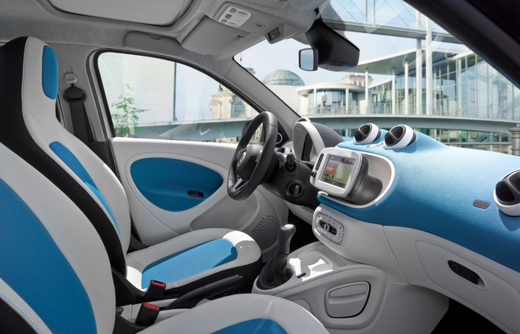 À l’intérieur, les deux Smart partagent la même planche de bord, qui présentera des aérateurs circulaires, à la place des compteurs en hauteur. On notera également une console centrale et une instrumentation dorénavant placée derrière le volant et centré sur un compteur. Des, courbes, ici et là viendront embellir l’ensemble en remplacement des éléments rectilignes d’avant, le tout se mariant parfaitement avec l’ambiance bicolore, aussi reprise à l’intérieur.