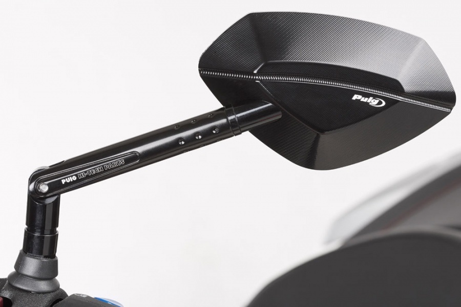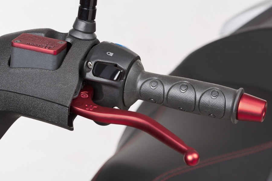 Dans sa livrée « Racing » elle parait esthétiquement très réussie ! Disponible dans deux coloris bi-tons (noir-rouge ou blanc-rouge), les détails ne passent pas inaperçus. On remarquera tout de suite les leviers de freins et les embouts de guidons anodisés rouge, comme sur les amortisseurs. Ici, les rétroviseurs en alu ont été travaillés pour leur donner cette forme particulière. Puisqu’il s’agit d’une version « Sport » elle est donc équipée d’un échappement Technigas et ses amortisseurs sont réglables.